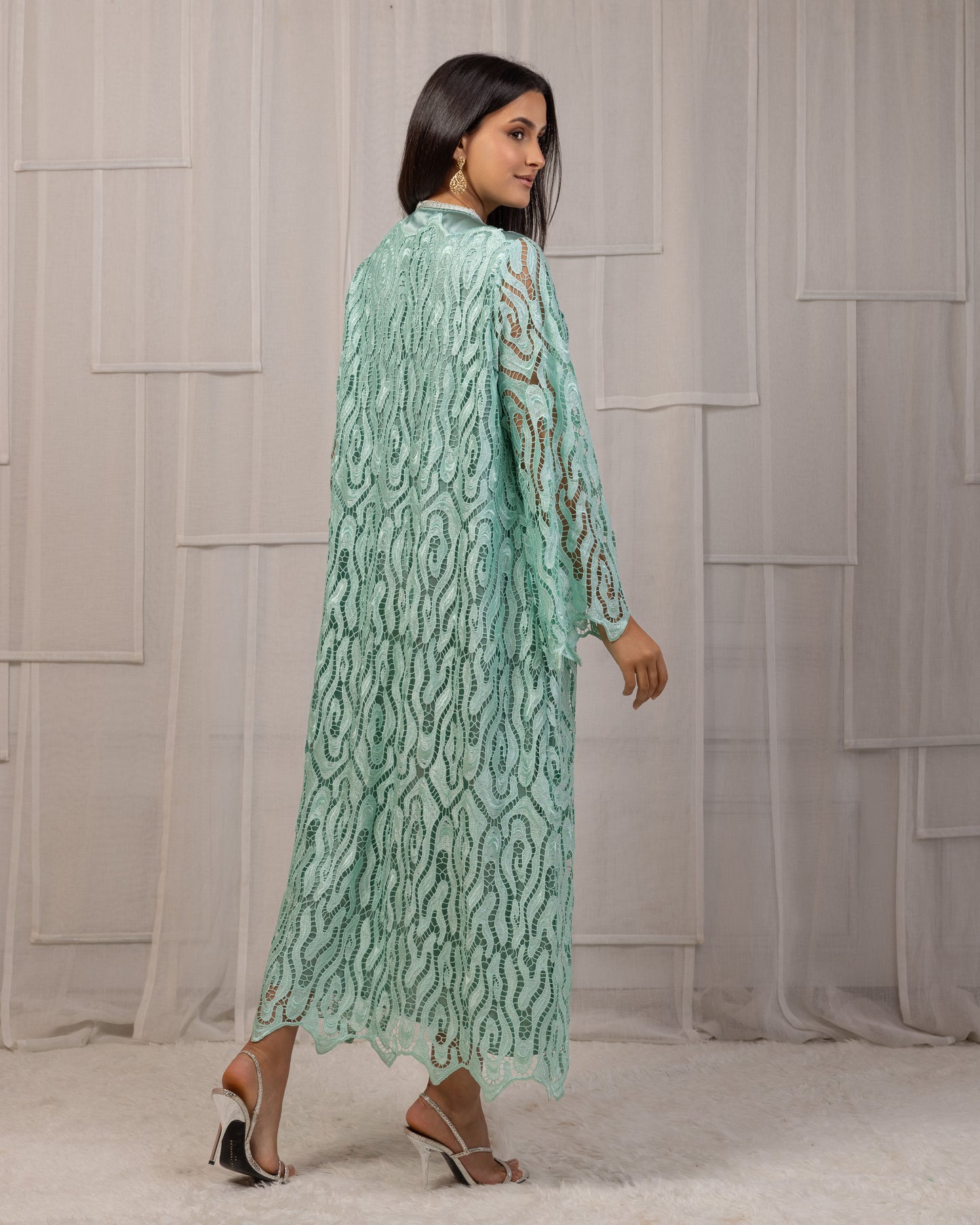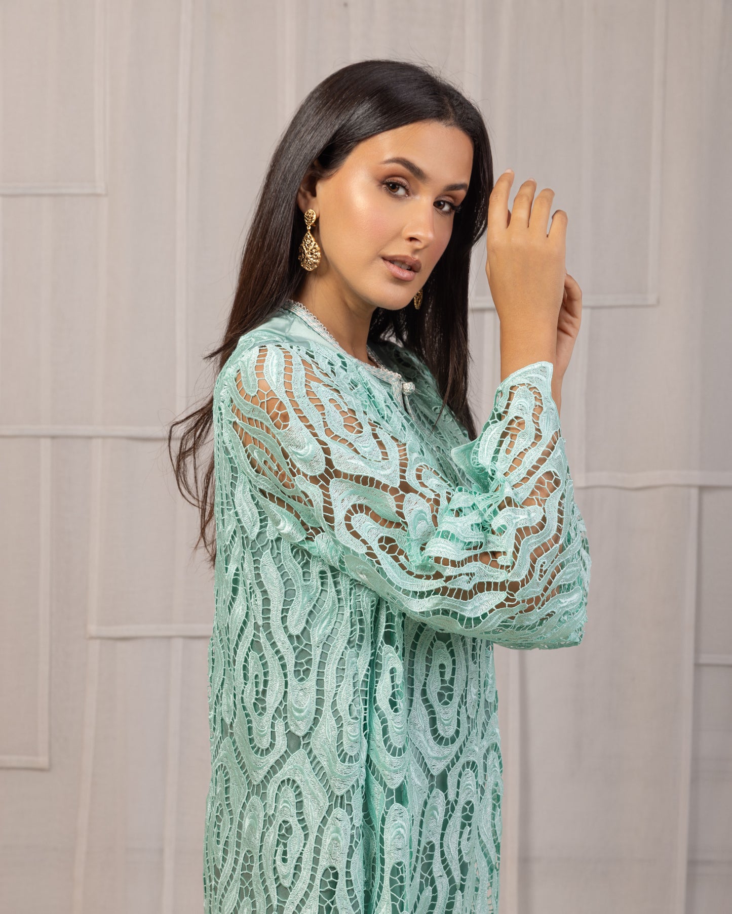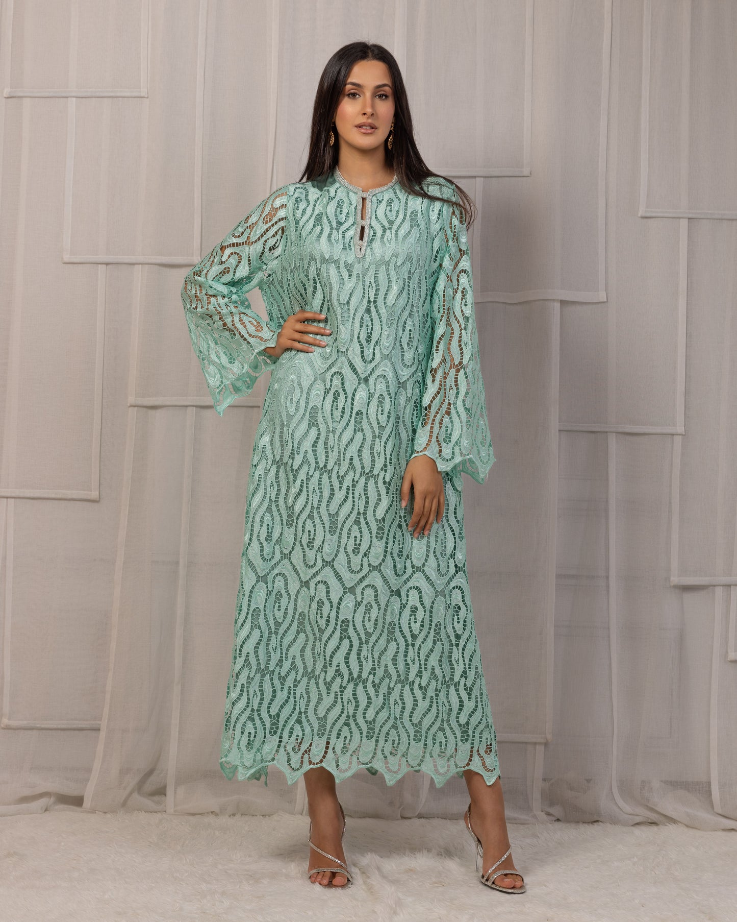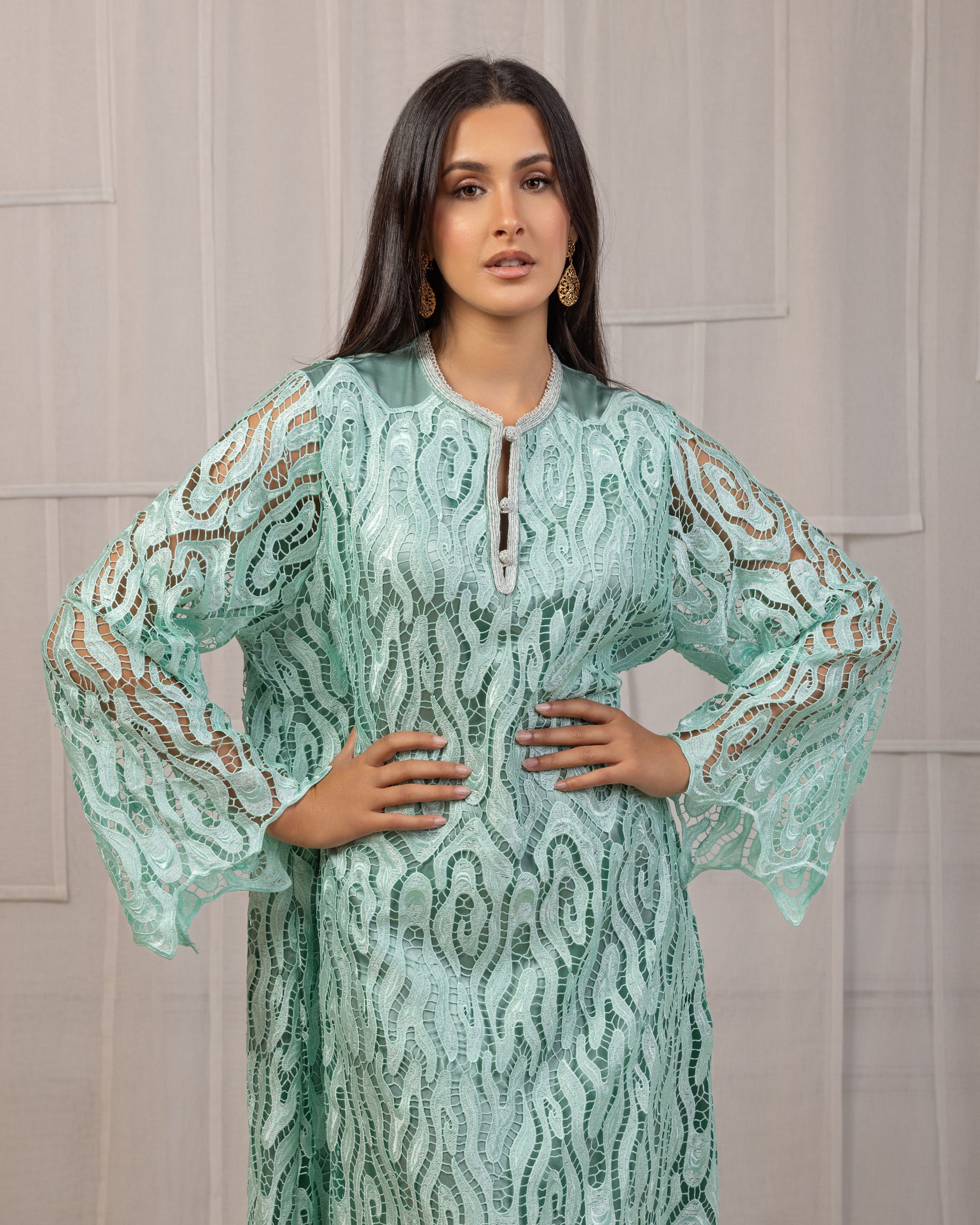 Caftan droit en guipure , col rond dégagé avec ouverture devant , manches longues en transparence , caftan doublé
