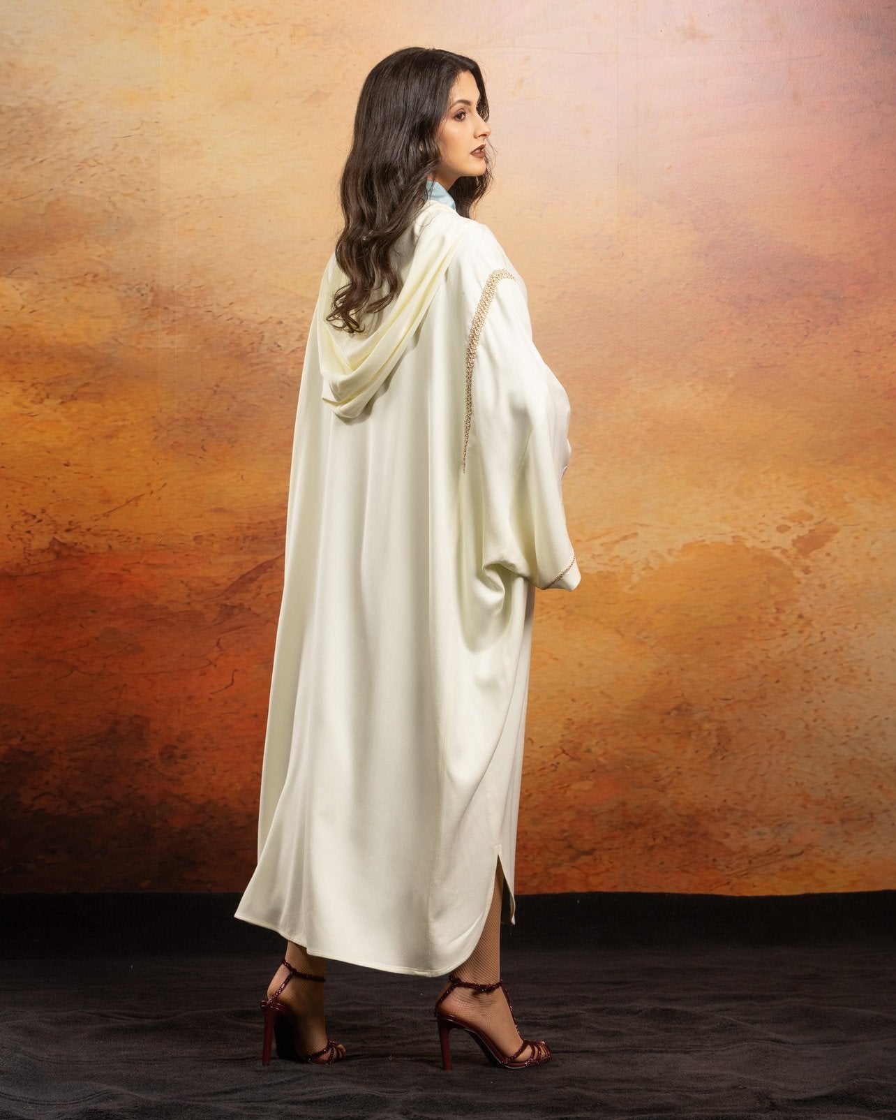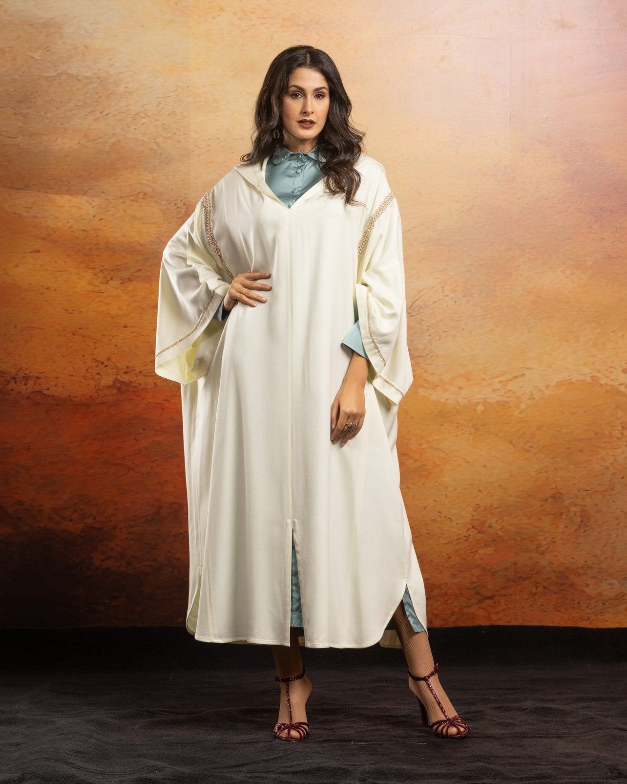 Jellaba oversize en Mlifa, manches longues, fentes sur les côtés et milieu devant.