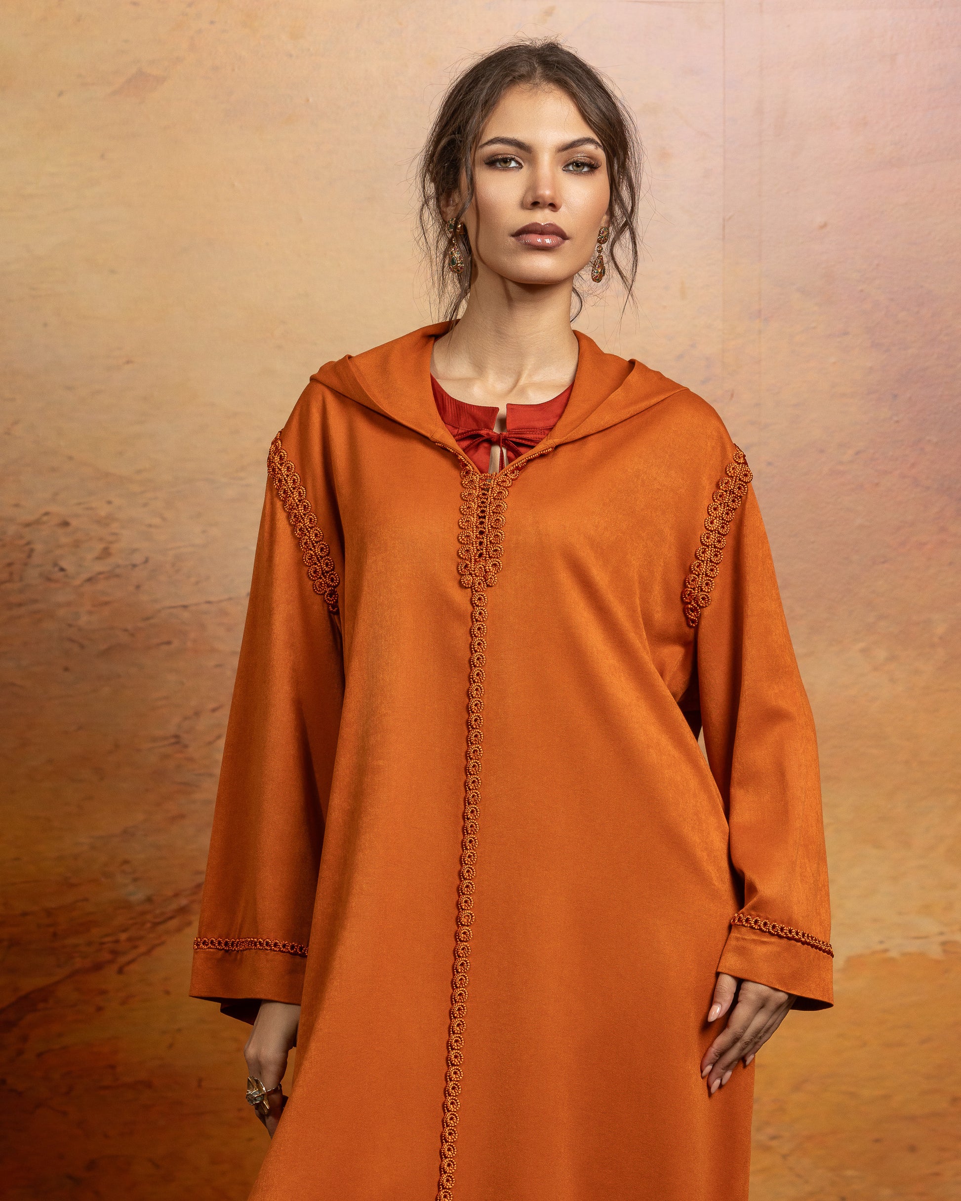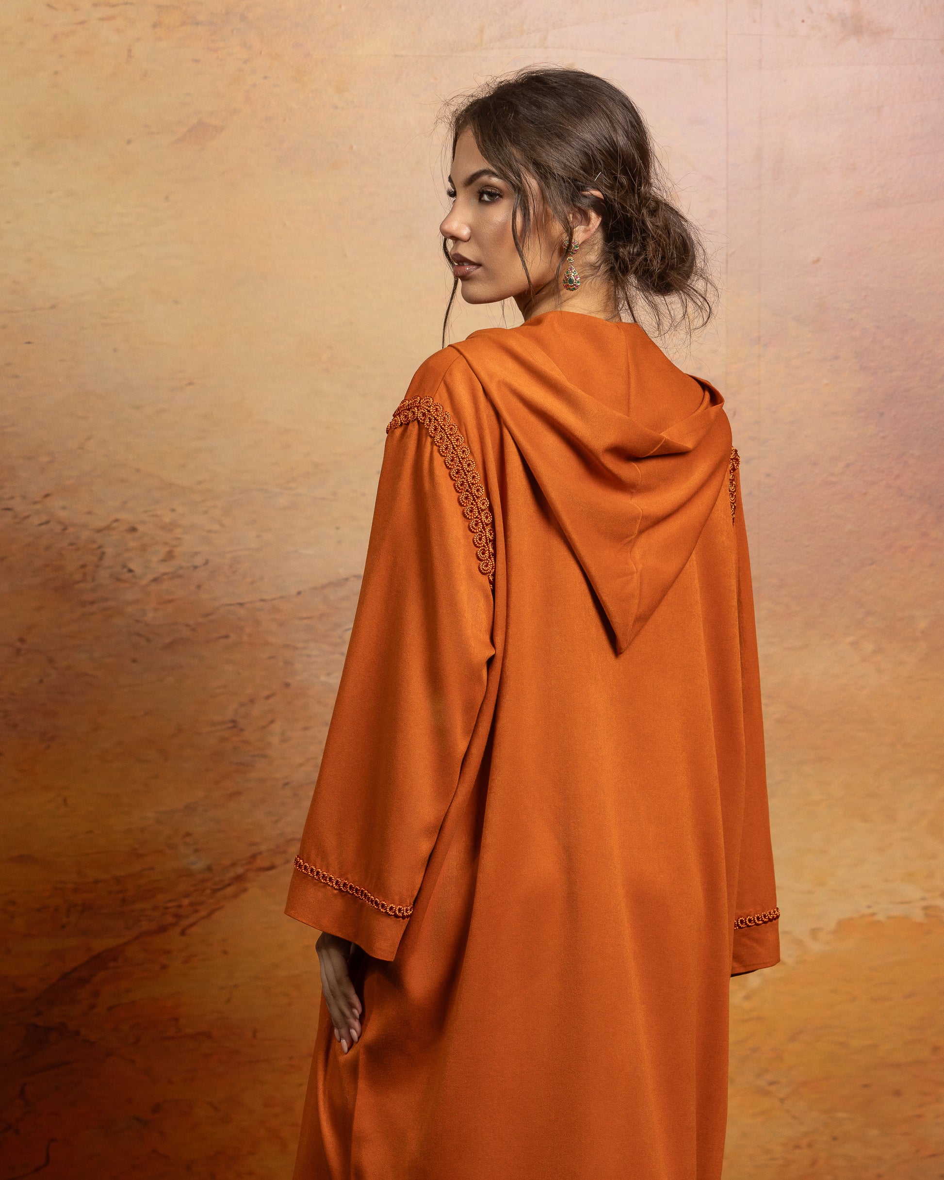 • Emplacements des Motifs : sur le devant du col ,la couture devant de la jellaba, épaules , et sur les bas des manches.