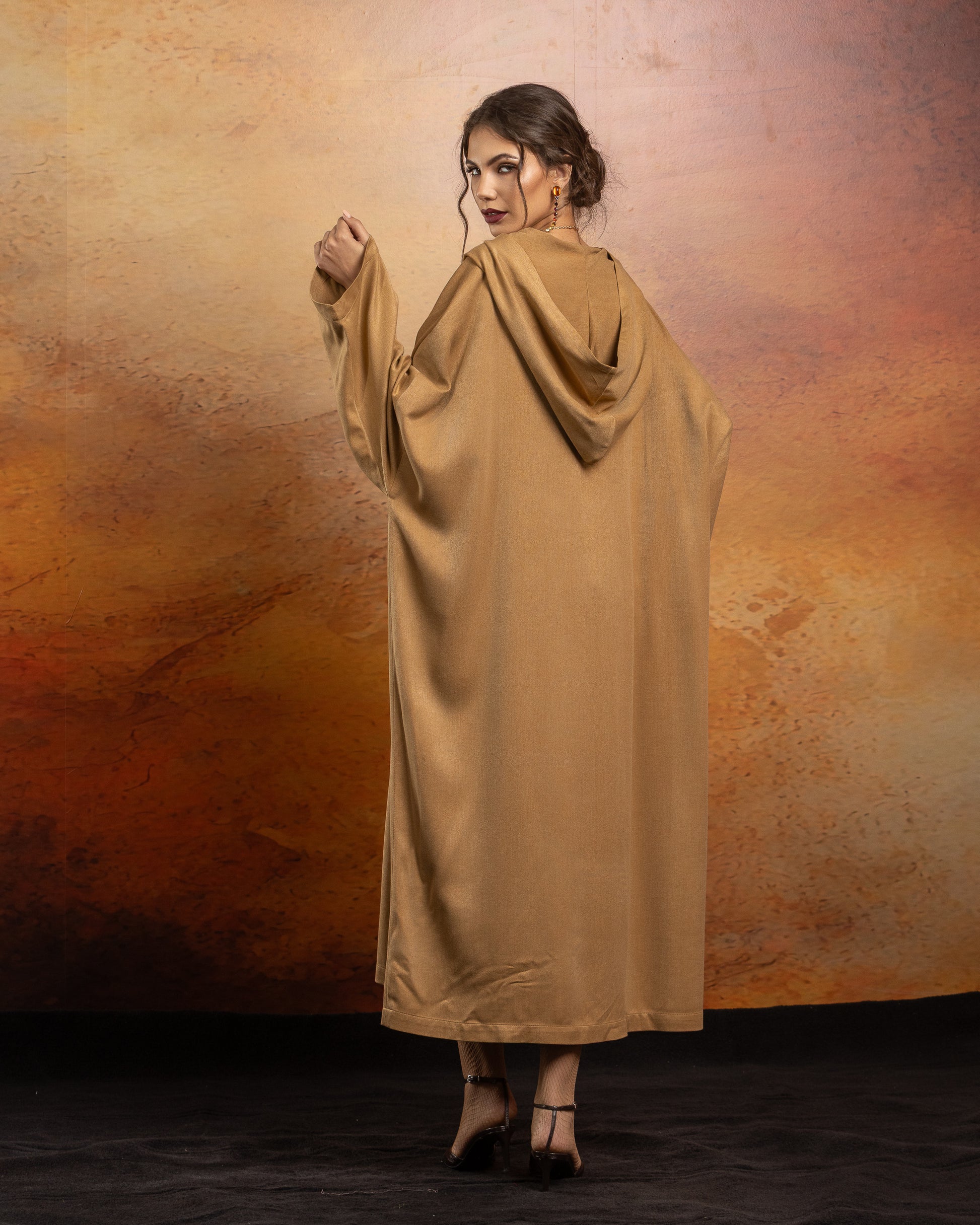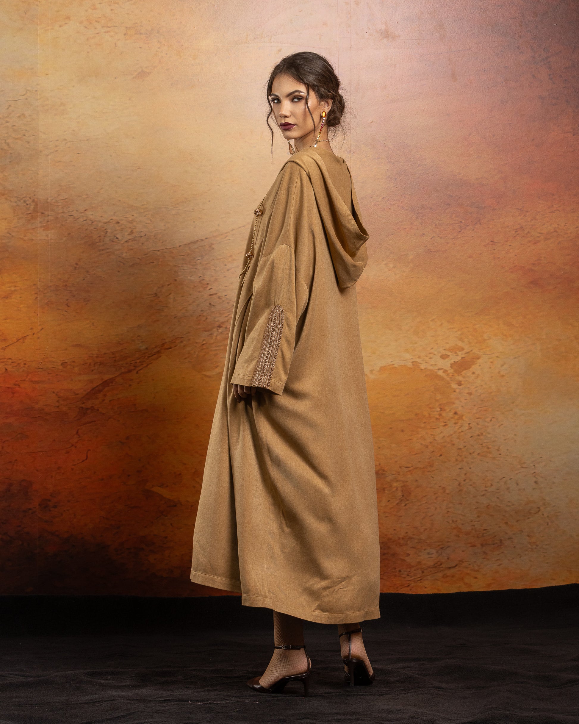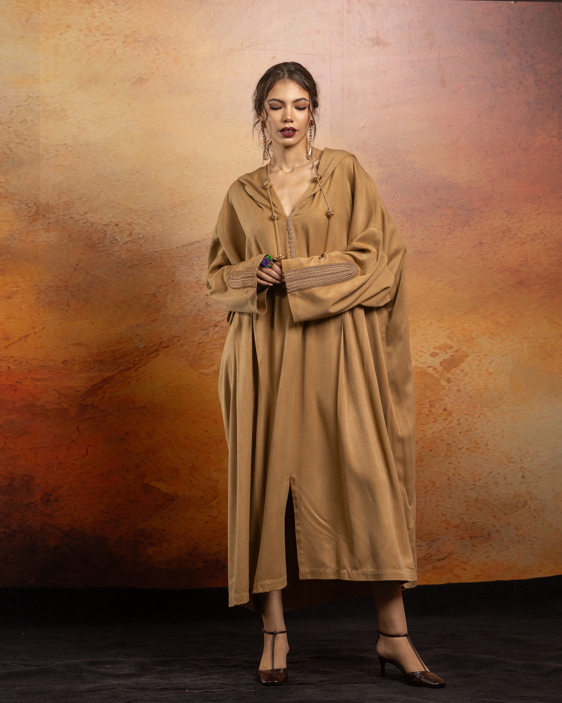 Jellaba oversize en Mlifa, manches longues, avec plis creux sur le devant, fentes sur milieu devant.