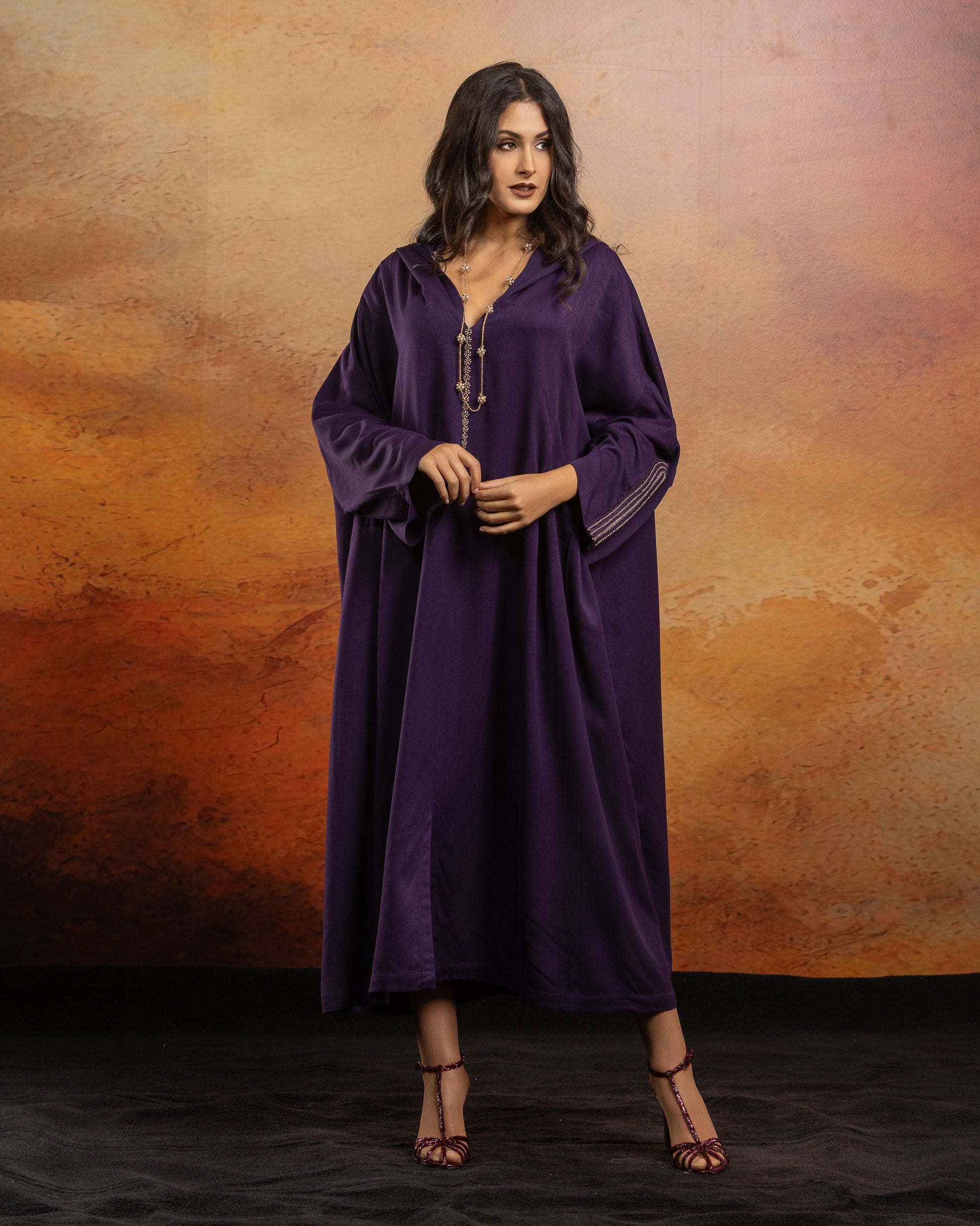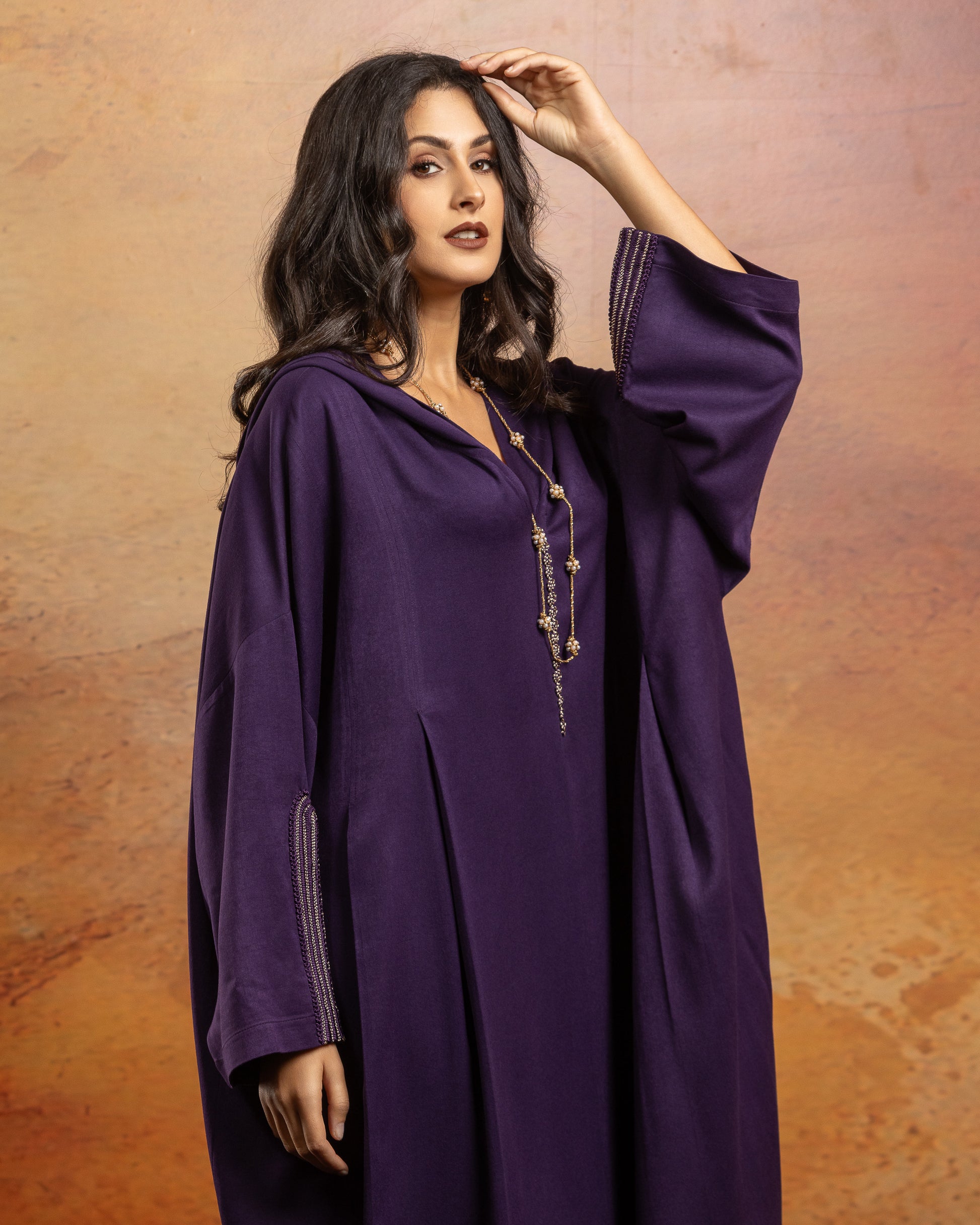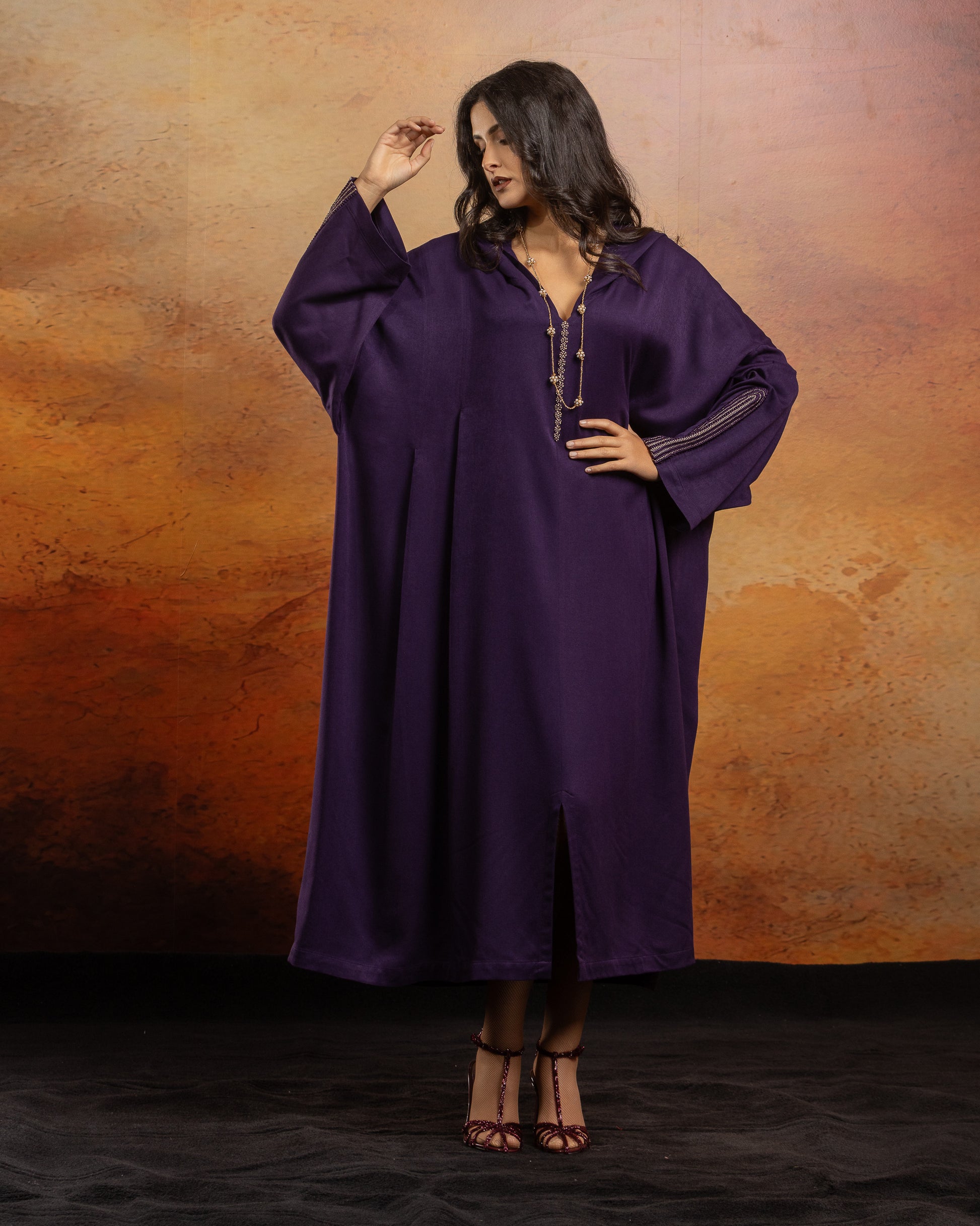 Jellaba oversize en Mlifa, manches longues, avec plis creux sur le devant, fentes sur milieu devant.