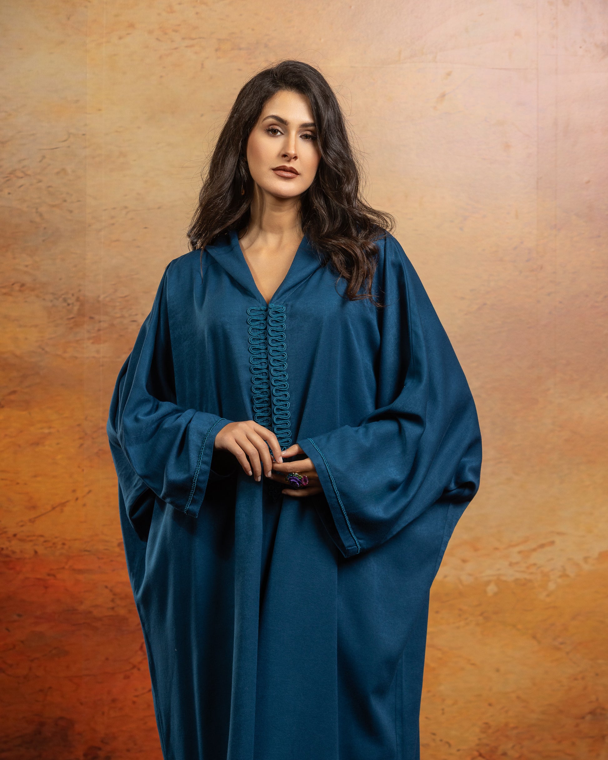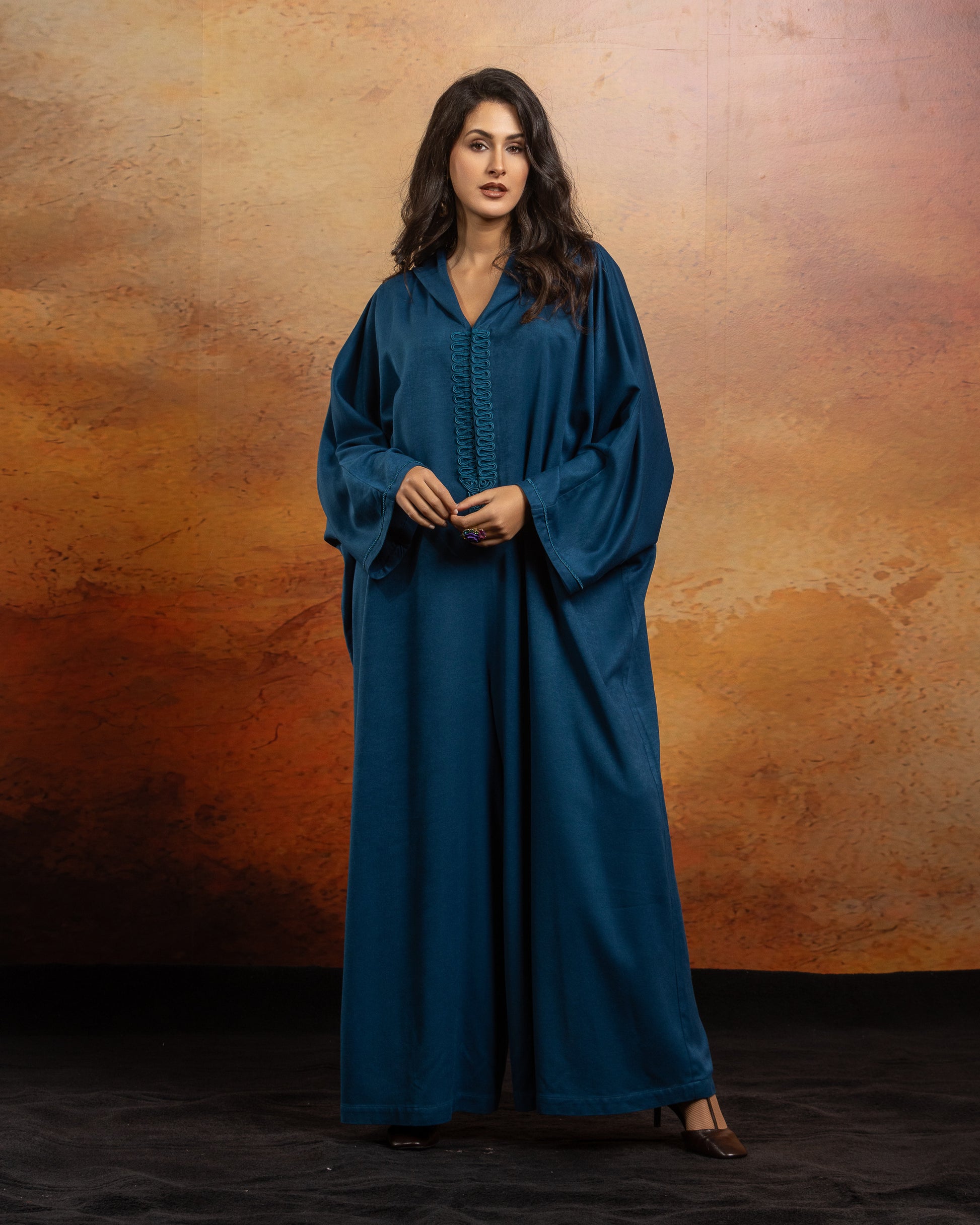 Jellaba combi oversize en Mlifa, manches raglantes longues, bas du pantalon large, boutonnée sur le milieu devant avec capuche.