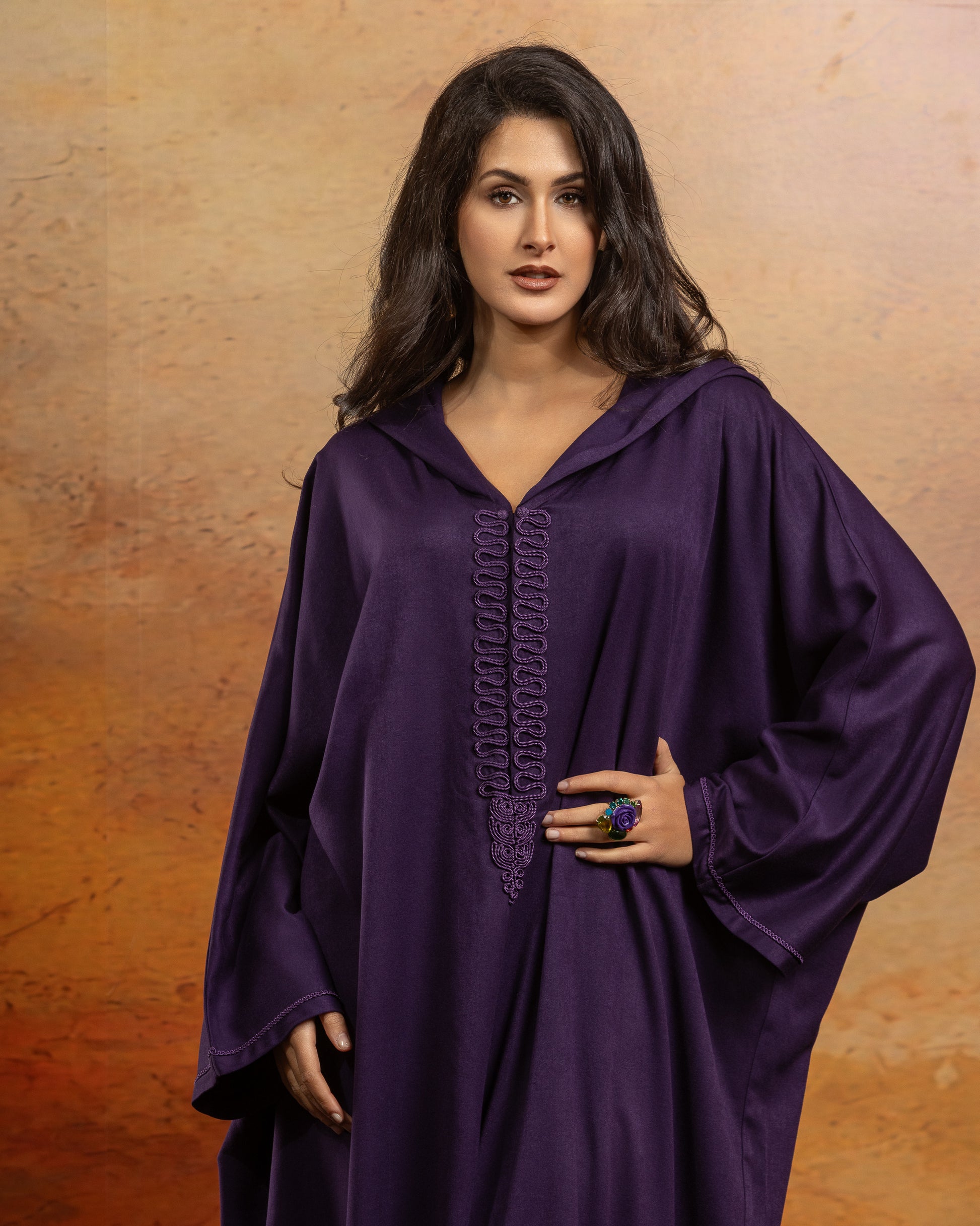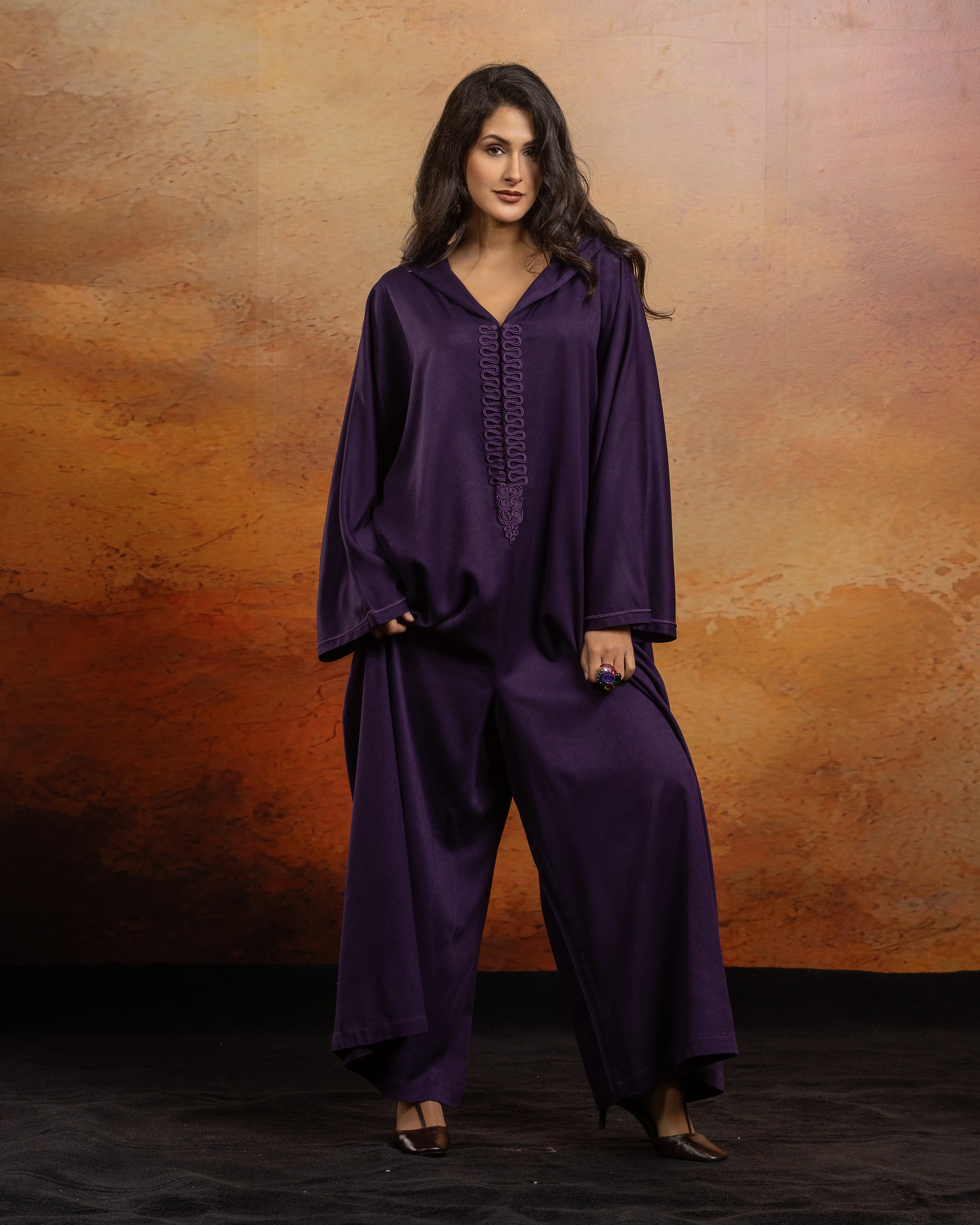 Jellaba combi oversize en Mlifa, manches raglantes longues, bas du pantalon large, boutonnée sur le milieu devant avec capuche.